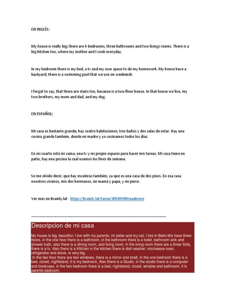 Descripcion de una casa. Al llegar a mi barrio te sentirás atraído por un gran jardín seguido por una puerta y un garaje cuyo color del metal es llamativo pues es vino tinto salteado de chispas negras una vez en la puerta encontraras una amplia sala con colores cálidos y un techo ubicado a mas de 8 metros de altura el cual permite el ingreso de luz a toda la casa en la sala justo al frente del ventanal que. Consejos para escribir un anuncio para vender una casa. Mi casa es un lugar muy agradable de buen tamaño y cuenta con espacios adecuados. En mi habitación hay una cama un armario grande una mesa y dos sillas un ordenador y la cama pequeña de mi perro.