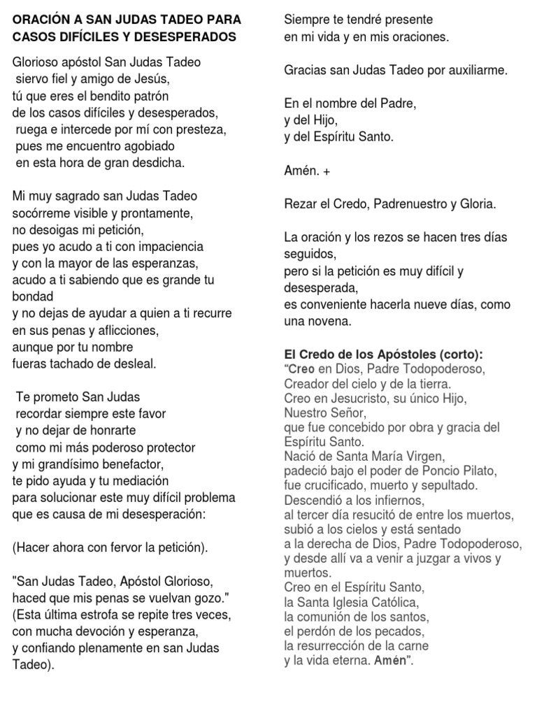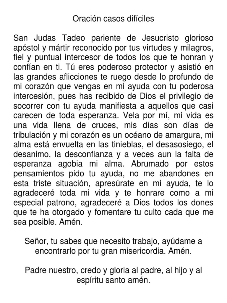 Oración a san judas tadeo para casos difíciles oh venerado san judas tadeo fiel amigo y siervo de nuestro señor son muchos los que te honran e invocan en todo el mundo eres el patrón de los imposibles de las causas desesperadas. A jesús siempre podremos pedirle y agradecerle todas las cosas que hace por nosotros a través de la oración como vamos a hacer a continuación. Glorioso patriarca san josé quien has sido el hijo predilecto del padre siendo guardián de la santísima virgen y santo padre adoptivo de cristo. Pongo mi amor en ti para que lo transformes en la.
