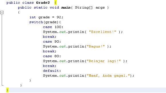 The case statement should be string literal. The value for a case must be a constant or a literal. Each value is called a case and the variable being switched on is chec. When java reaches a break keyword it breaks out of the switch block.